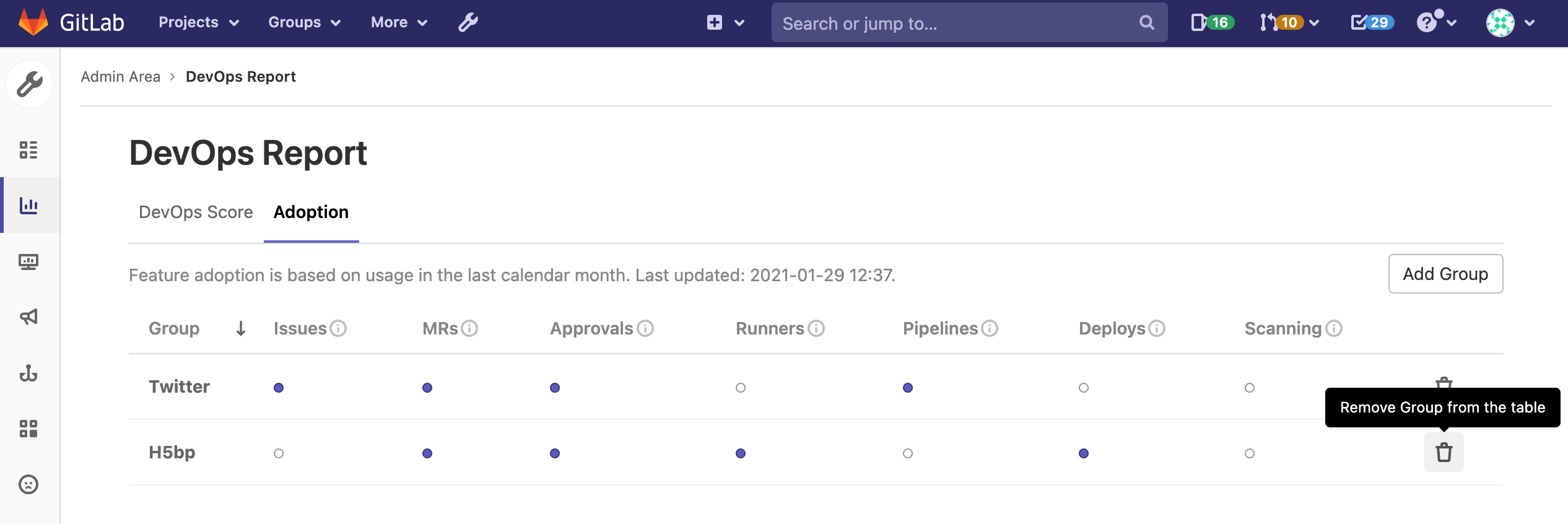 DevOps Adoption is deployed behind a feature flag that is disabled by default. GitLab administrators with access to the GitLab Rails console can opt to enable it.