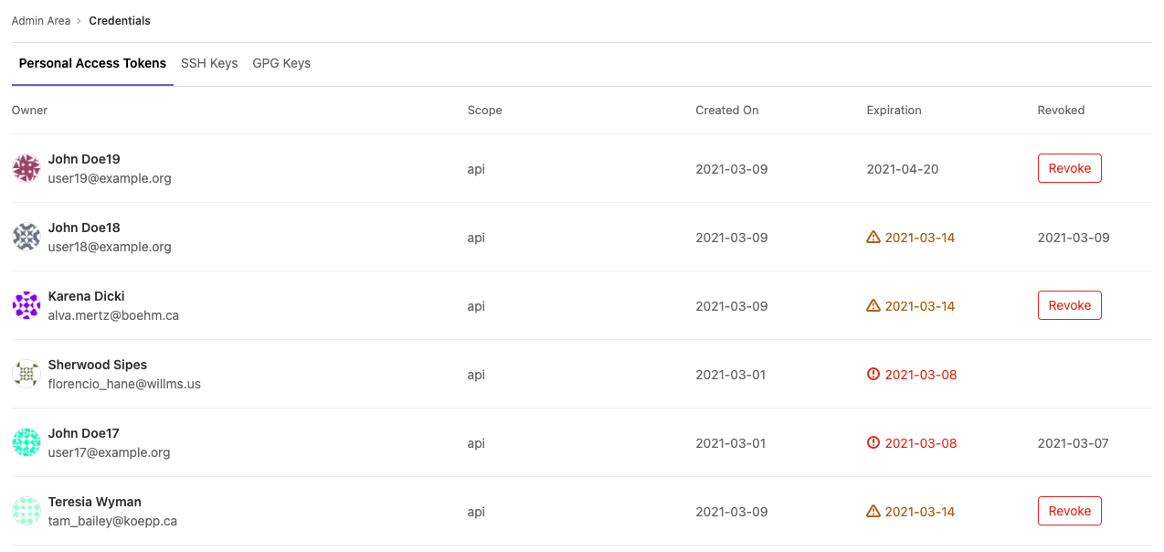 Using Credentials inventory, you can see all the personal access tokens (PAT), SSH keys, and GPG keys that exist in your GitLab instance. In addition, you can revoke and delete and see: