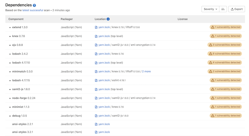 Displayed dependencies are initially sorted by the severity of their known vulnerabilities, if any. They can also be sorted by name or by the packager that installed them.