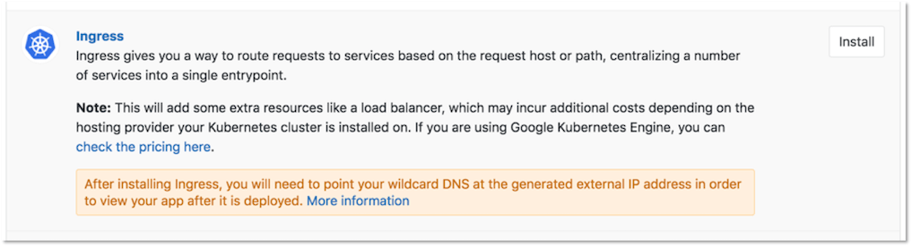 After Ingress has been installed successfully, click the Install button next to the JupyterHub application. You need the Jupyter Hostname provided here in the next step.