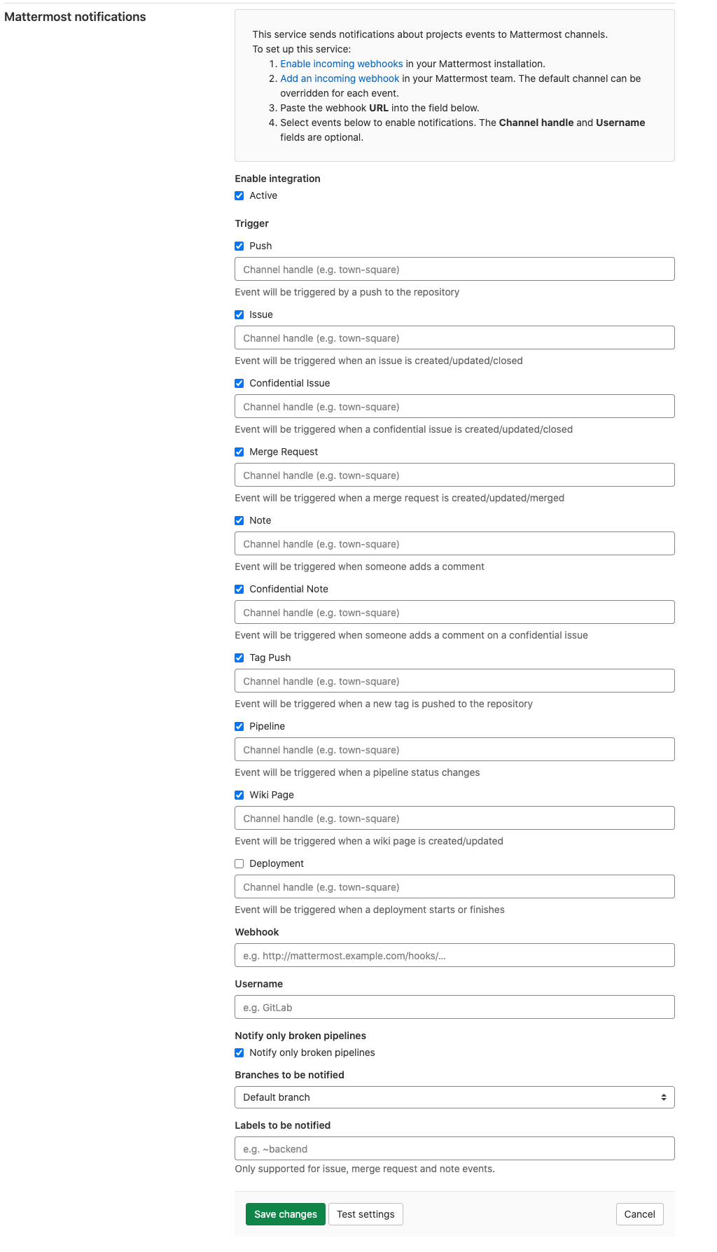 Navigate to the Integrations page and select the Mattermost notifications service to configure it. There, you see a checkbox with the following events that can be triggered: