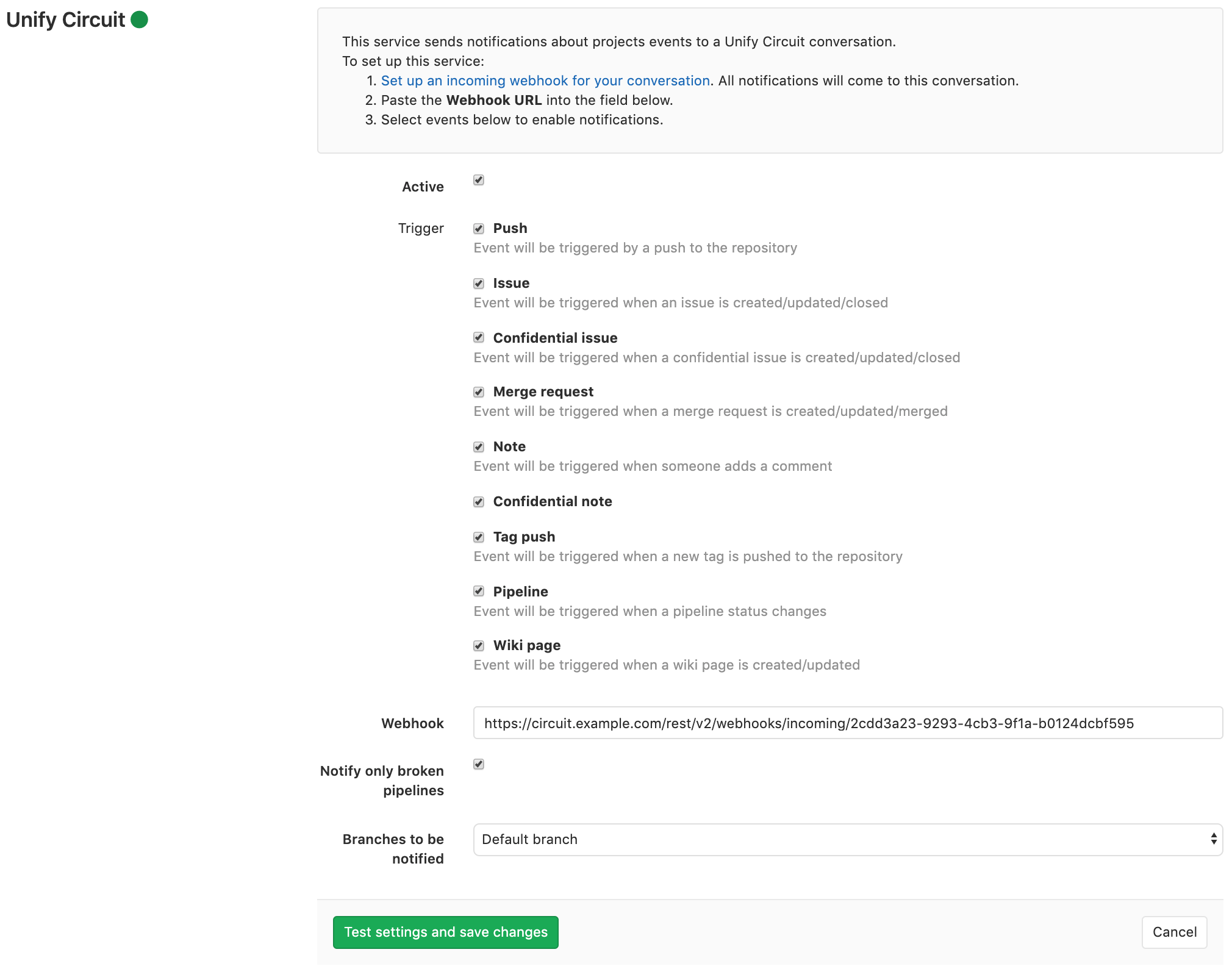 When you have the Webhook URL for your Unify Circuit conversation webhook, you can set up the GitLab service.