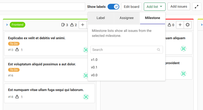Issue boards build on the existing issue tracking functionality and labels. Your issues appear as cards in vertical lists, organized by their assigned labels, milestones, or assignees.
