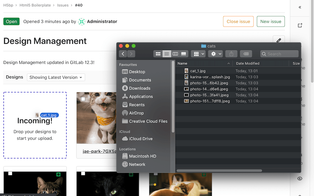 Introduced in GitLab Premium 12.9, you can drag and drop designs onto the dedicated drop zone to upload them.