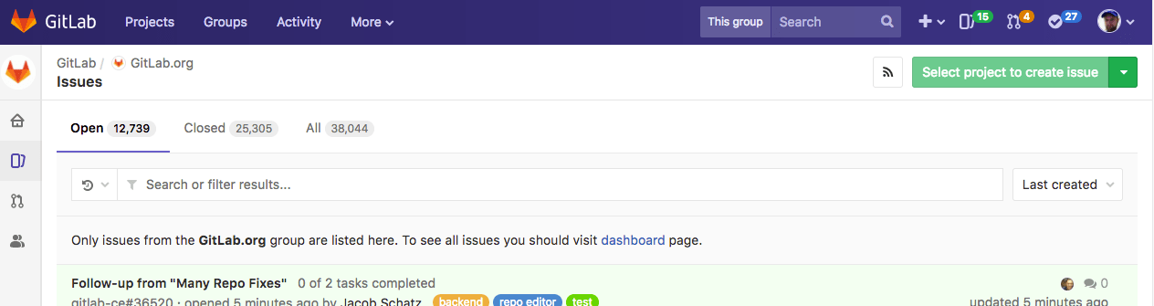 Go to the Group dashboard and click Issues in the sidebar to visit the Issue Tracker for all projects in your Group. Select the project you'd like to add an issue for using the dropdown button at the top-right of the page.