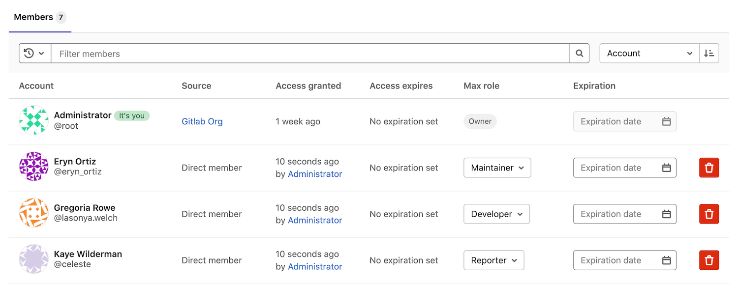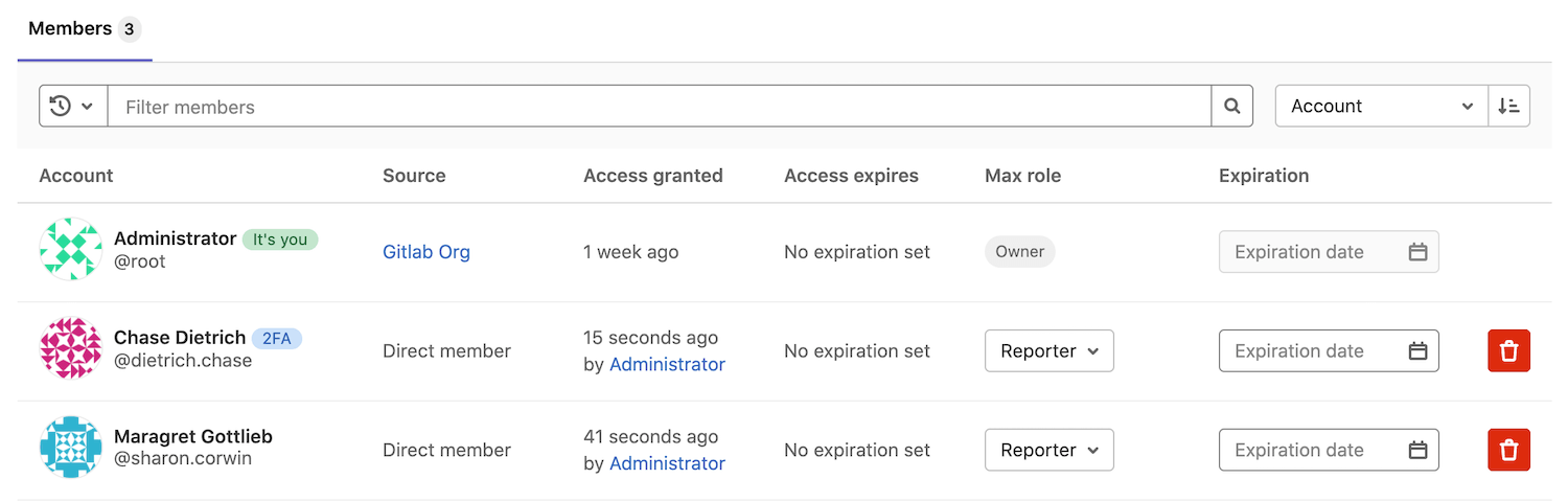 The following sections illustrate how you can filter and sort members in a project. To view these options, navigate to your desired project, go to Members, and include the noted search terms.