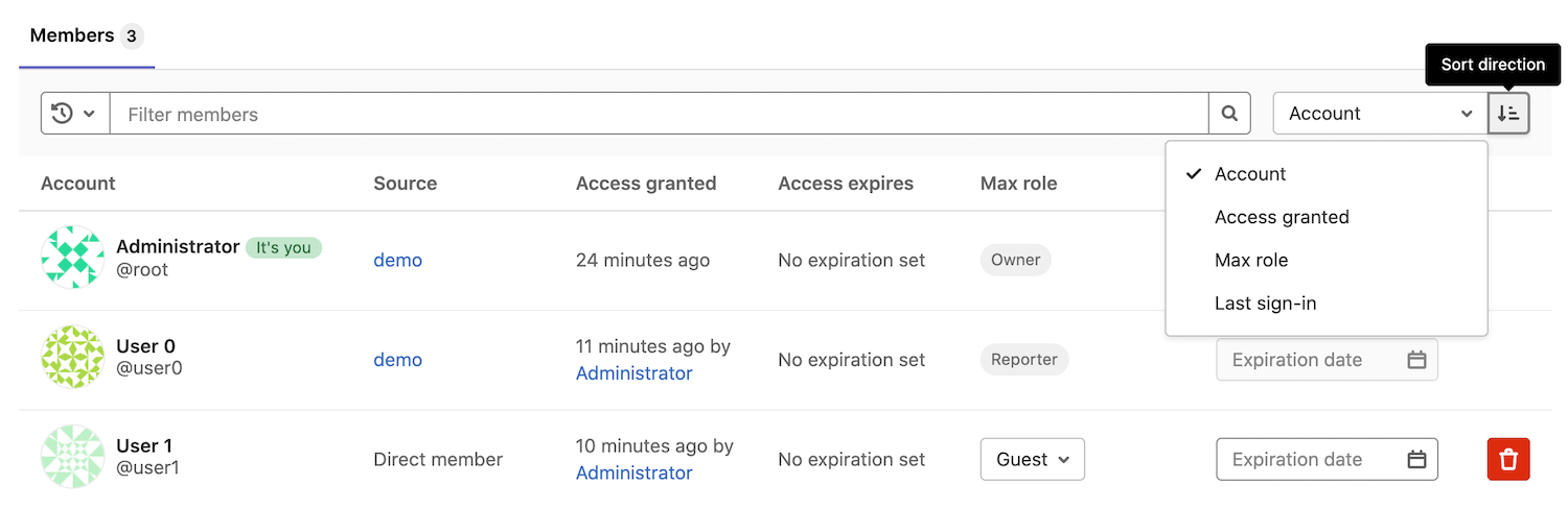 You can sort members by Account, Access granted, Max role, or Last sign-in in ascending or descending order.