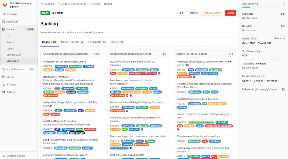 For group milestones, a burndown chart is in the milestone view, showing the progress of completing a milestone.