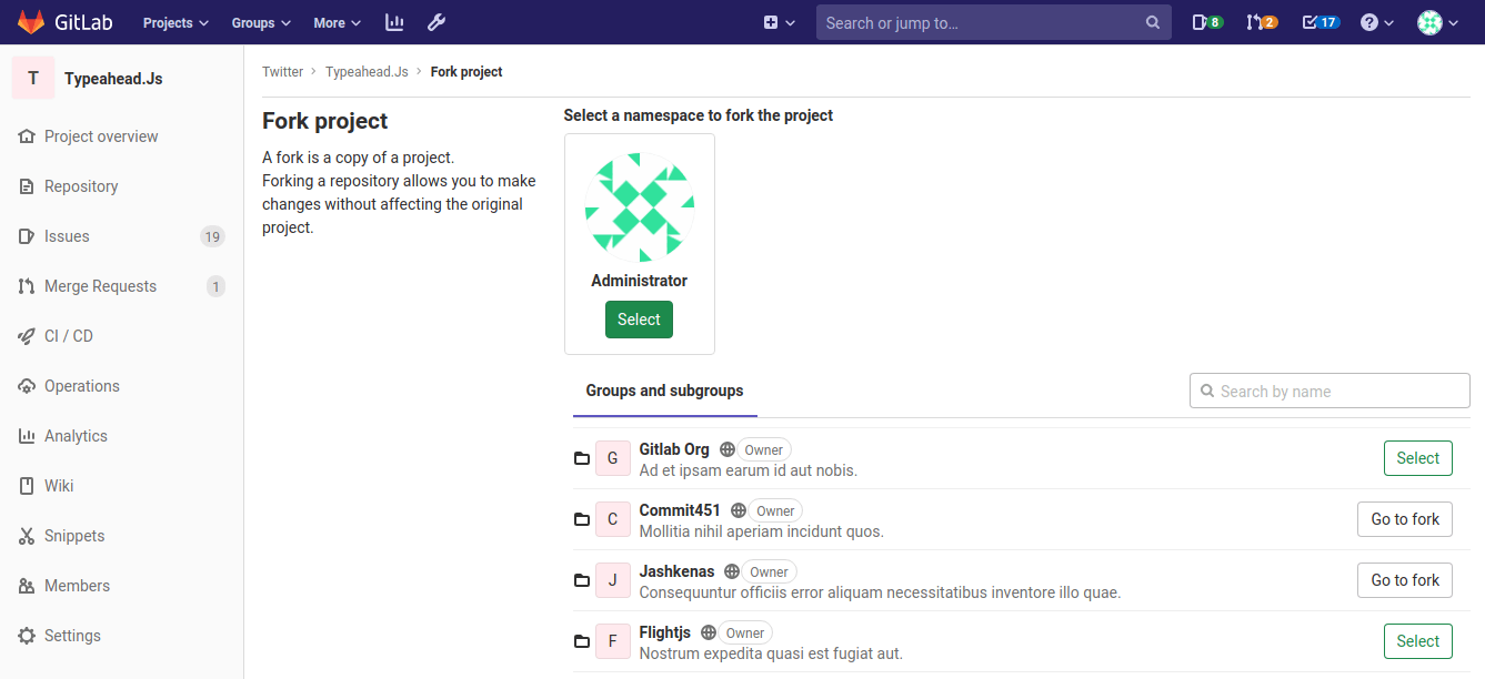 Click a namespace to fork to. Only namespaces you have Developer and higher permissions for are shown.